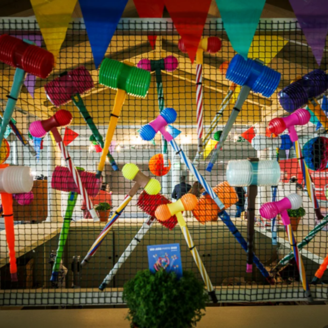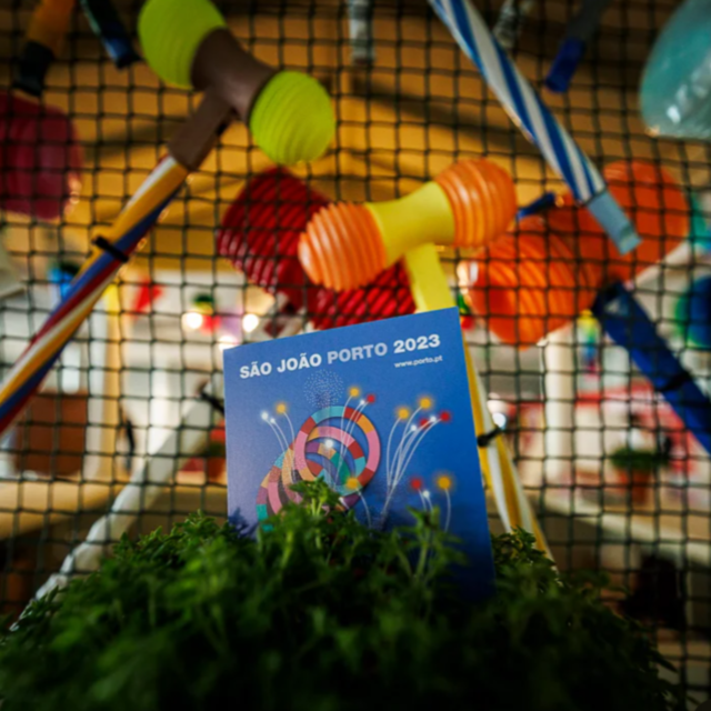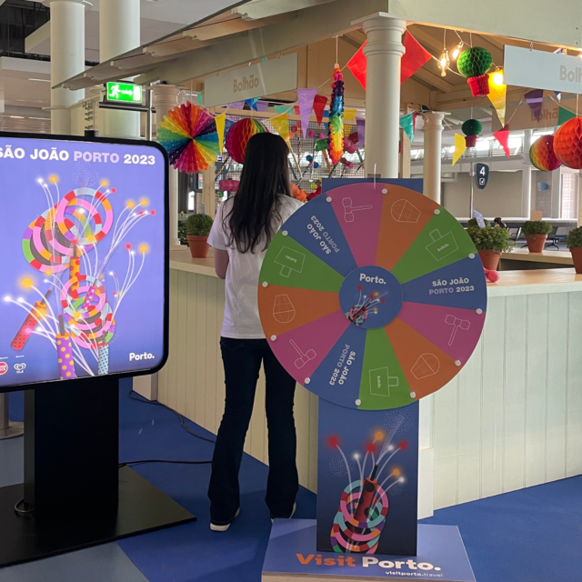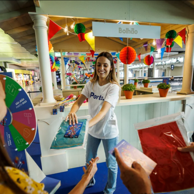 Inspired by Bolhão Market, we created a historic-style stall decorated with traditional São João elements, featuring some of the festival’s most iconic symbols: toy hammers, colourful balloons, illustrated postcards and special giveaways.